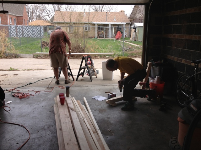 So we're building a table. By "we", I mostly mean my dad and Matt, but hey, I've been sanding the crap out of all the wood, which counts for something. That's a lot of work! :-) I'm also in charge of staining the whole project (and sealing), which I can only hope won't be a total disaster since that will basically make or break the whole deal. I've been dying to have a farmhouse table for a long, long time, and now that we have a funky little "dining room" with our cute white bench, I figured now was as good a time as any to try and put one together ourselves thereby saving big buck$.